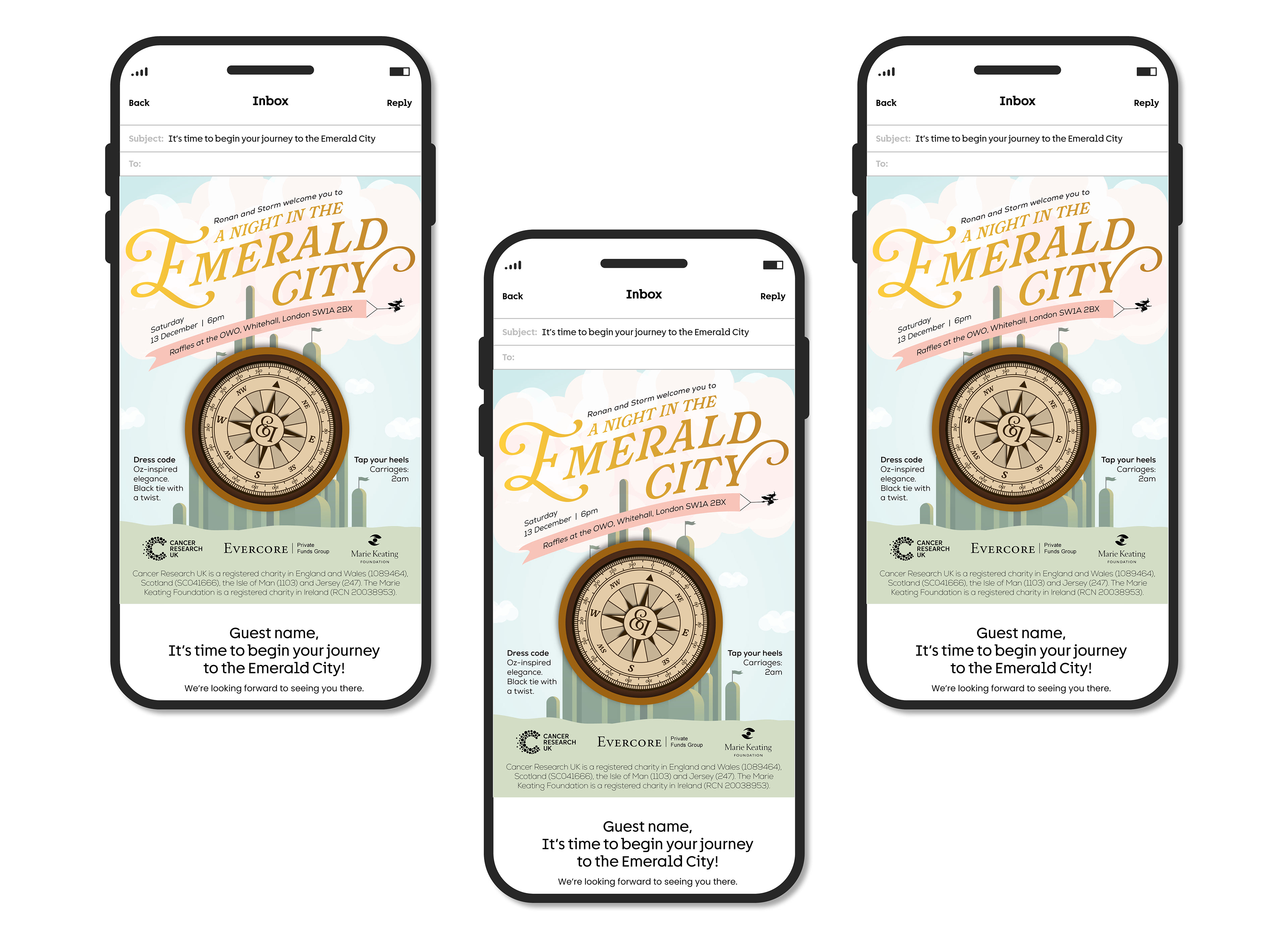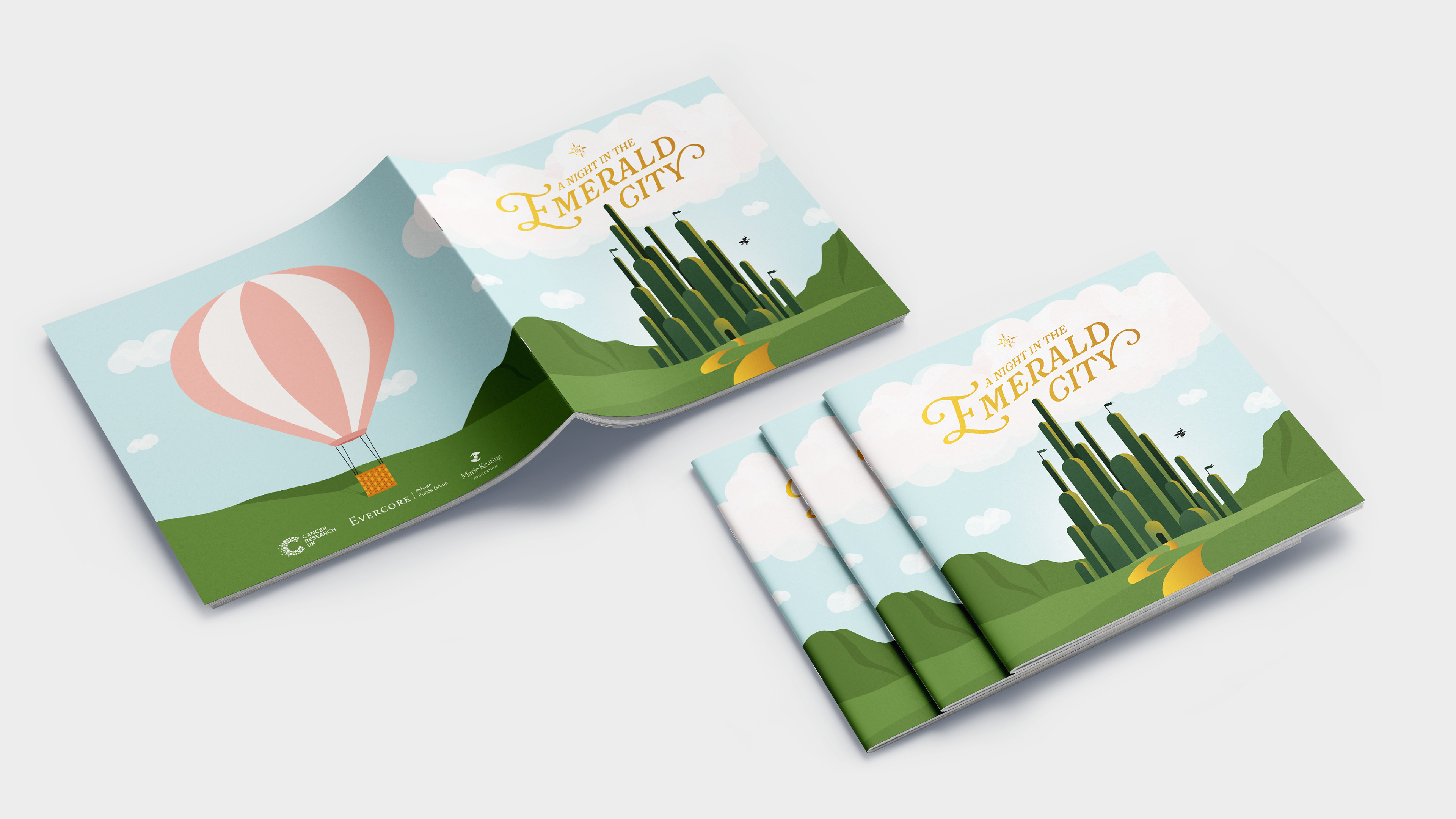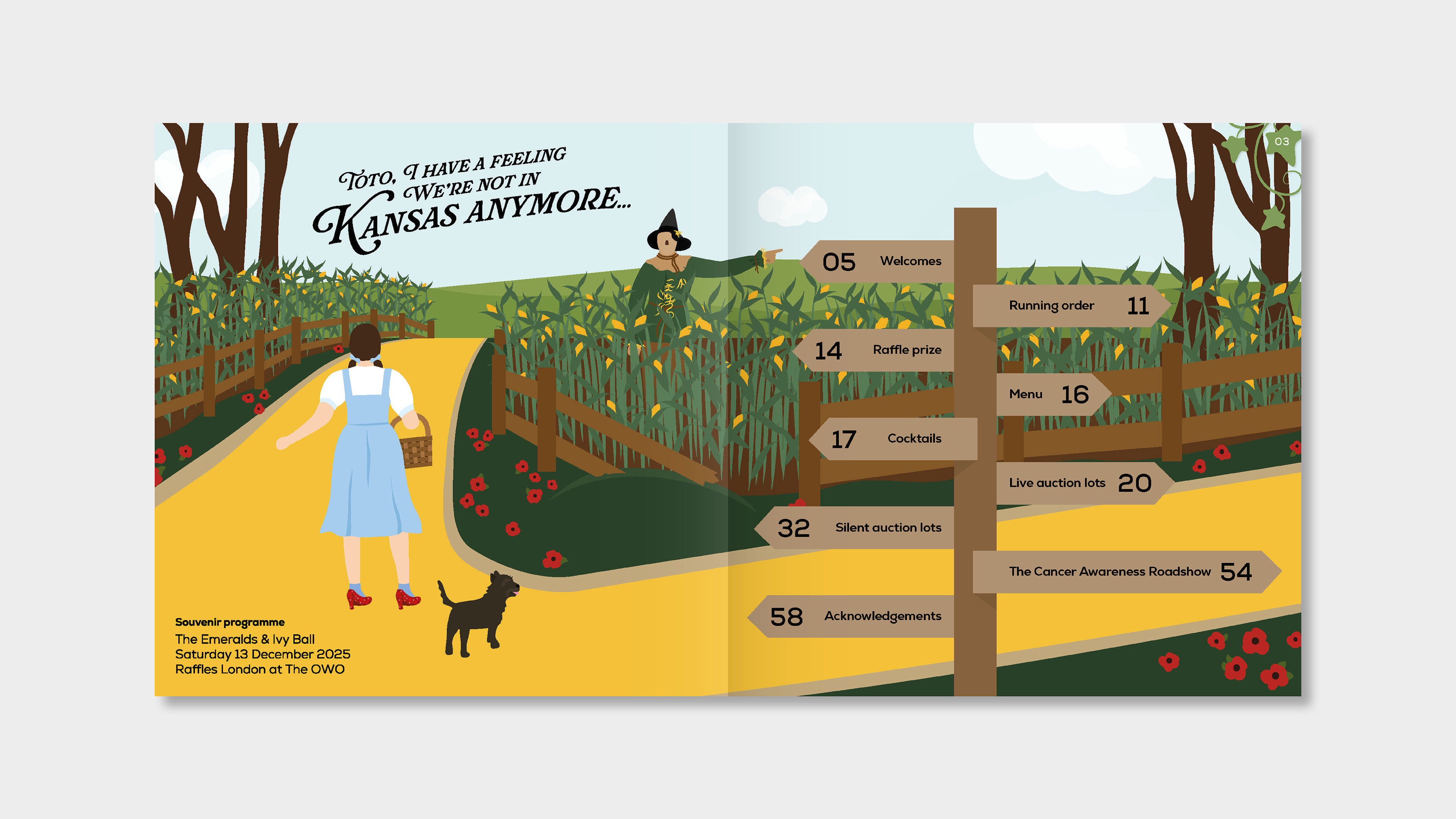 The Emeralds & Ivy Ball is CRUK's flagship annual event, held in partnership with Ronan and Storm Keating and the Marie Keating Foundation. This event raises vital funds for the Cancer Awareness Roadshow. Each year, the event features a specific theme and in 2025, the chosen theme was A Night in the Emerald City, inspired the Wizard of Oz. As lead designer for the brief, I developed two concepts for the client, showing them one dreamy, playful route, and one elegant, glitzy route. Once the client chose the dreamy, playful route, I developed the concept further, building out an illustrated world for guests to enter. Each asset features a step on guests' journeys to the Emerald City, much like Dorothy embarks on a journey of her own. Throughout there are nods to their journey using devices such as a compass, map, balloon, tickets to see the Wizard, and, of course, the yellow brick road itself. In each illustration, you will see key scenes brought to life through illustration. This event raised £860,000 on the night and the creative received glowing feedback.