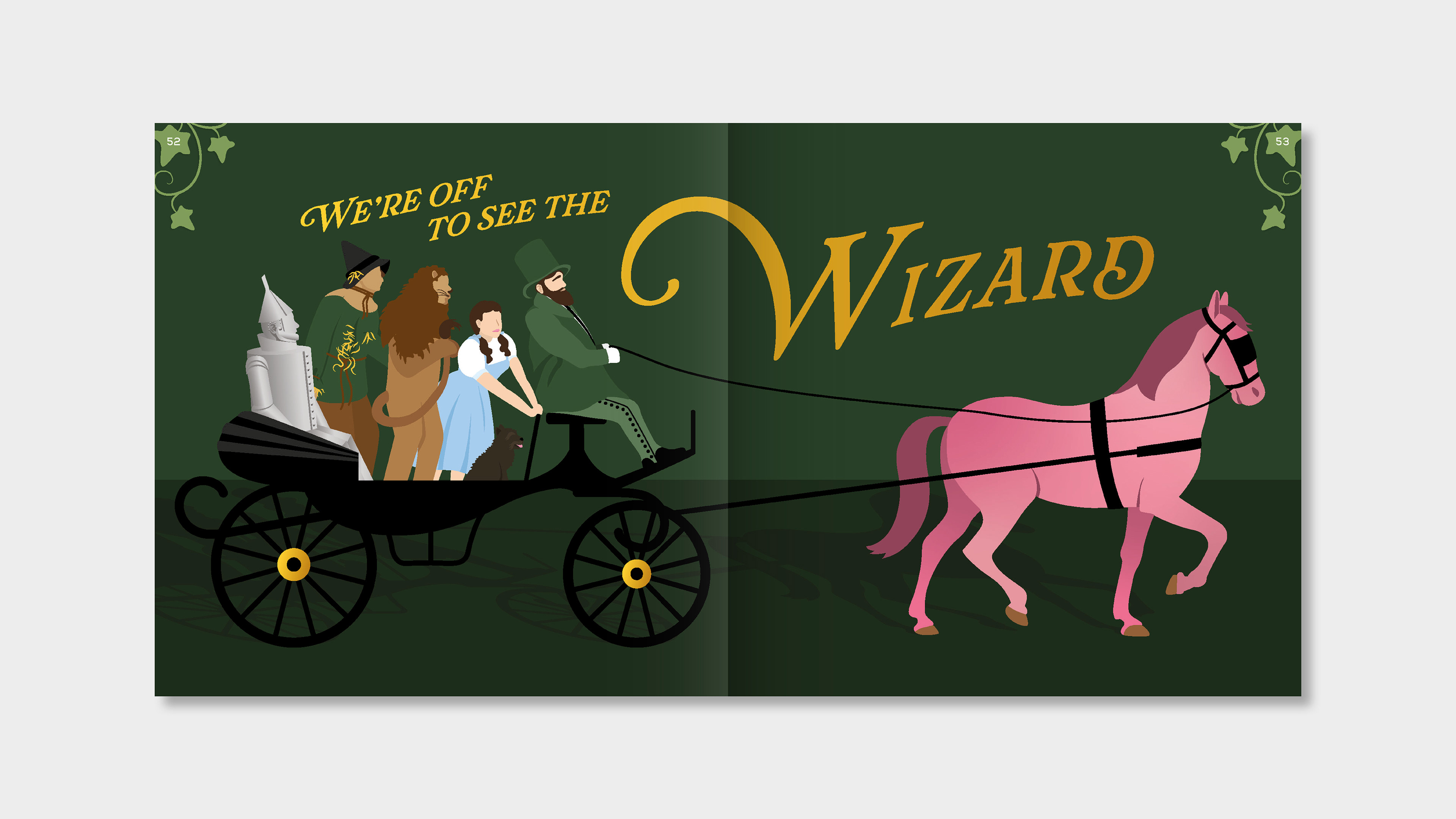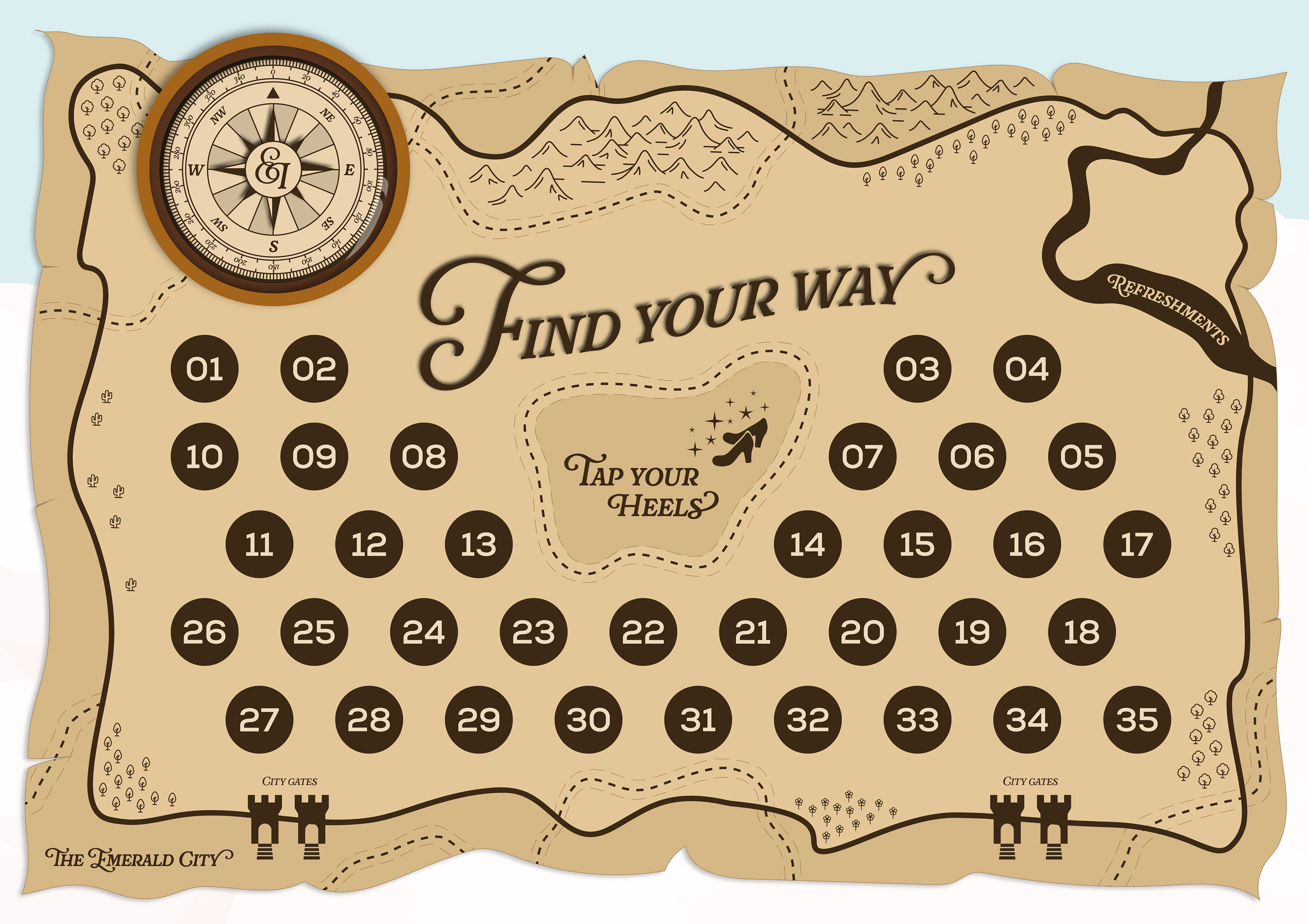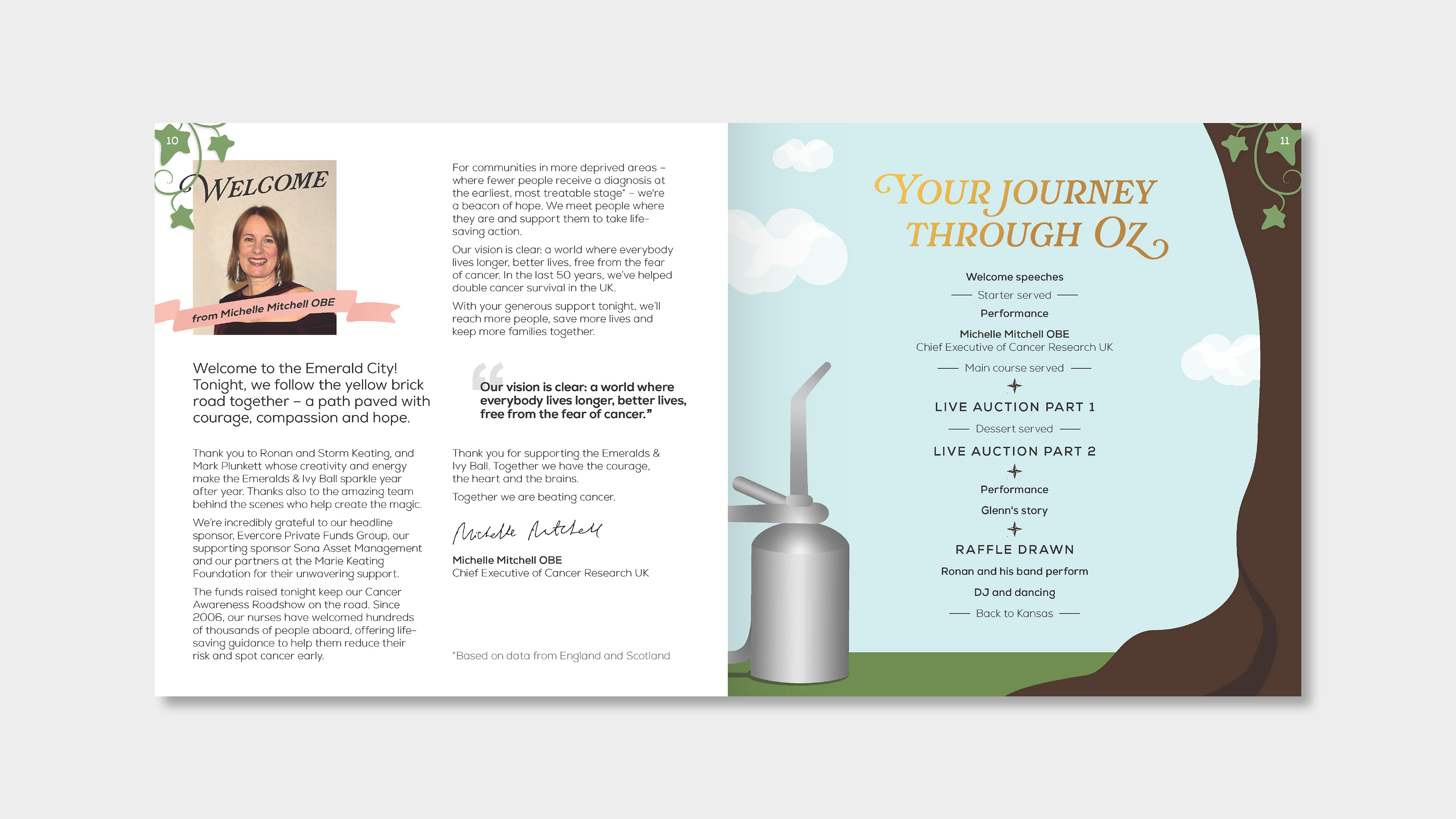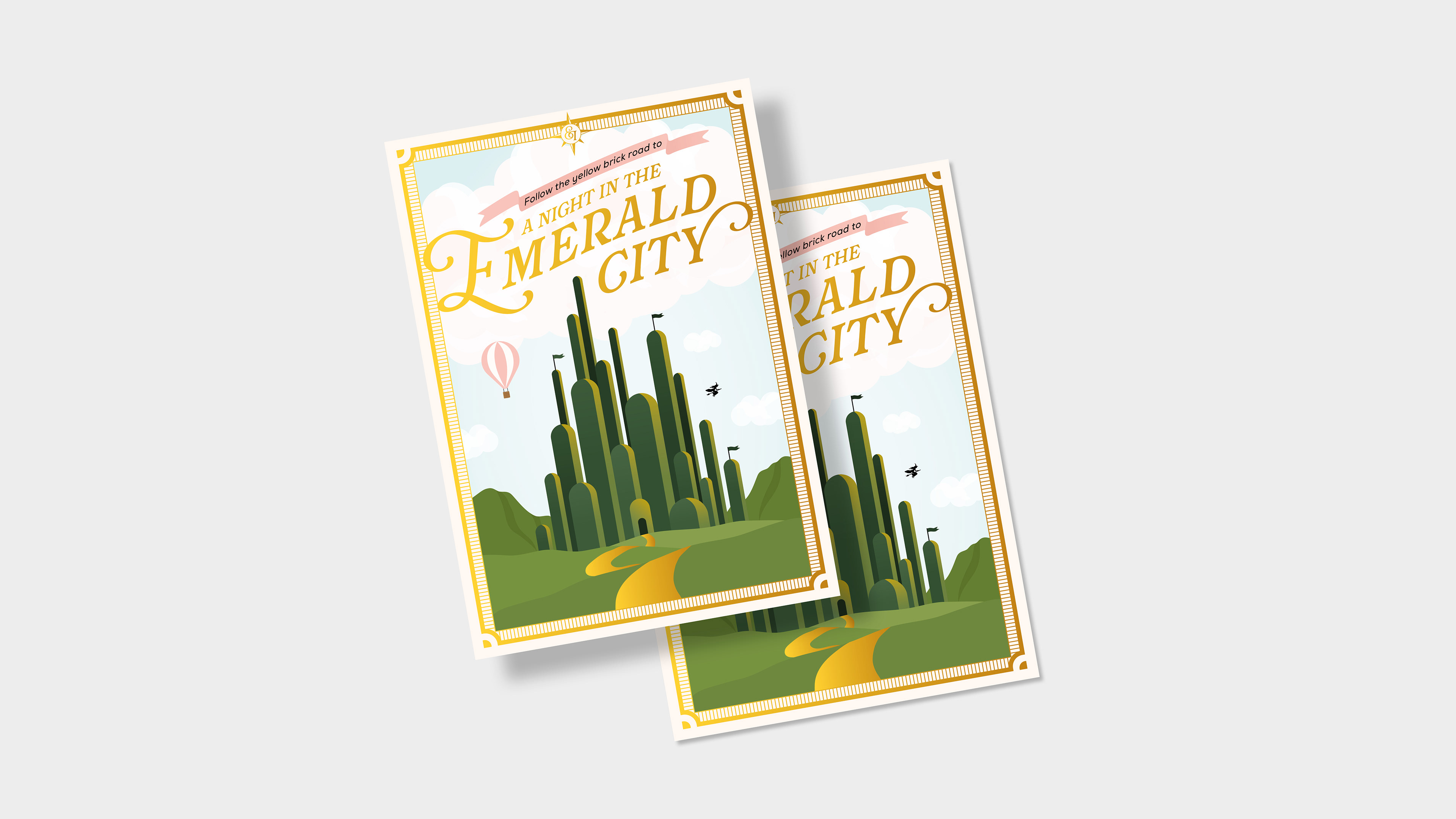 The Emeralds & Ivy Ball is CRUK's flagship annual event, held in partnership with Ronan and Storm Keating and the Marie Keating Foundation. This event raises vital funds for the Cancer Awareness Roadshow. Each year, the event features a specific theme and in 2025, the chosen theme was A Night in the Emerald City, inspired the Wizard of Oz. As lead designer for the brief, I developed two concepts for the client, showing them one dreamy, playful route, and one elegant, glitzy route. Once the client chose the dreamy, playful route, I developed the concept further, building out an illustrated world for guests to enter. Each asset features a step on guests' journeys to the Emerald City, much like Dorothy embarks on a journey of her own. Throughout there are nods to their journey using devices such as a compass, map, balloon, tickets to see the Wizard, and, of course, the yellow brick road itself. In each illustration, you will see key scenes brought to life through illustration. This event raised £860,000 on the night and the creative received glowing feedback.
